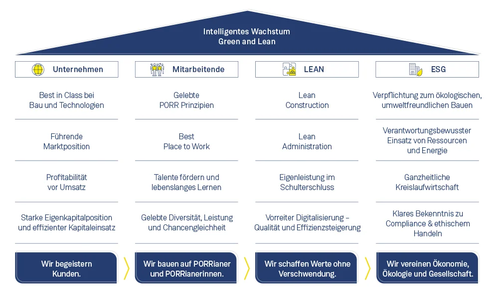 Die PORR besteht seit ĂŒber 150 Jahren, Innovation und Vielfalt waren stets die Bausteine unseres Erfolges. Und das wird weiterhin so sein. Aus unseren Erfahrungen, dem enormen Wissen im Unternehmen und den Herausforderungen der Zukunft haben wir die neue Strategie âGreen and Leanâ entwickelt. Sie bedeutet den nĂ€chsten Schritt in die Zukunft.