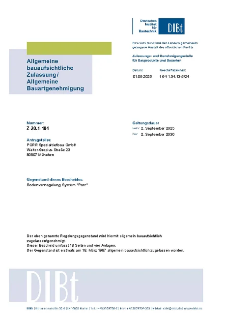 With the publication and introduction of DIN EN 12716:2019-03 "Execution of special civil engineering works - Jet grouting; German version EN 12716:2018" as a technical building regulation, the planning and execution of load-bearing elements using jet grouting or high-pressure injection is regulated (see MVV TB, No. 1.2.2.7). A general type approval is no longer required. The use of subsoil improvement methods is permitted by the building authorities and does not require a type approval. You can find out more about the building inspectorate framework on the website of the Deutsches Institut für Bautechnik.