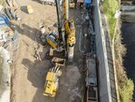 Die vorbereitenden Arbeiten begannen bereits im August mit der Herstellung einer Voreinschnittswand für den späteren Durchschlag vom Hauptstollen in Richtung Ausgleichsbecken. Direkt davor entsteht nun eine rund 7 Meter tiefe Baugrube, die der PORR Spezialtiefbau realisiert. Sie wird durch eine überschnittene Bohrpfahlwand mit einem Durchmesser von 120 cm gesichert und mit 28 temporären Litzenankern sowie 4 Dauerankern rückverankert. Die bis zu 14 Meter langen Bohrpfähle werden mit einer Drehbohranlage eingebracht. Für höchste Präzision sorgt eine eigens gefertigte Bohrschablone.