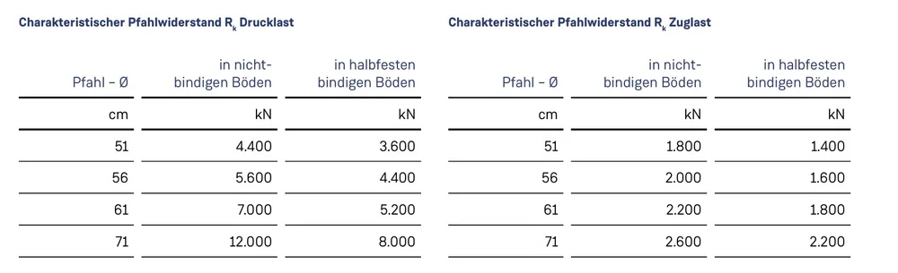 - Sehr hohe Pfahllasten erzielbar: Charakteristische Pfahlwiderstände Rk bis 12.000 kN